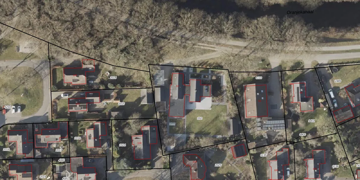 Het perceel waarop Eikenweg 57 staat heeft een oppervlakte van 2036 m². Dit is een zeer groot perceel. De perceeloppervlakte wordt geregistreerd door het Kadaster. Gedetailleerde informatie over de maten van dit perceel kunt u vinden in het rapport Kadastrale kaart met maatvoering van Eikenweg 57.
