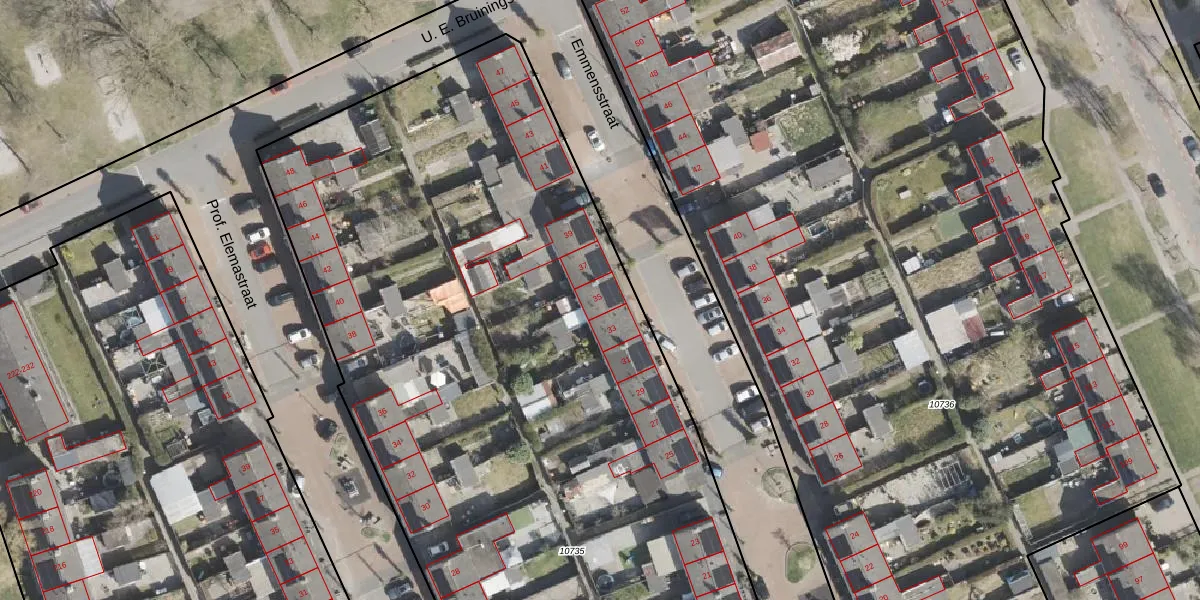 Het perceel waarop Emmensstraat 35 staat heeft een oppervlakte van 8004 m². Dit is een zeer groot perceel. De perceeloppervlakte wordt geregistreerd door het Kadaster. Gedetailleerde informatie over de maten van dit perceel kunt u vinden in het rapport Kadastrale kaart met maatvoering van Emmensstraat 35.