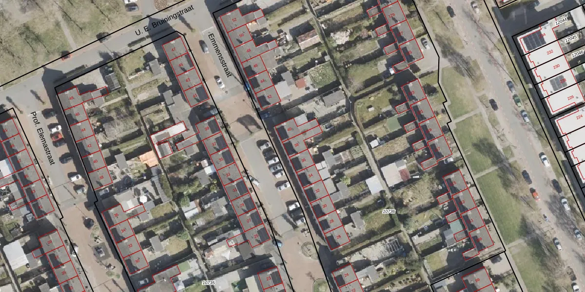 Het perceel waarop Emmensstraat 38 staat heeft een oppervlakte van 9251 m². Dit is een zeer groot perceel. De perceeloppervlakte wordt geregistreerd door het Kadaster. Gedetailleerde informatie over de maten van dit perceel kunt u vinden in het rapport Kadastrale kaart met maatvoering van Emmensstraat 38.