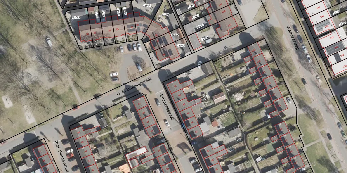 Het perceel waarop Emmensstraat 52 staat heeft een oppervlakte van 9251 m². Dit is een zeer groot perceel. De perceeloppervlakte wordt geregistreerd door het Kadaster. Gedetailleerde informatie over de maten van dit perceel kunt u vinden in het rapport Kadastrale kaart met maatvoering van Emmensstraat 52.