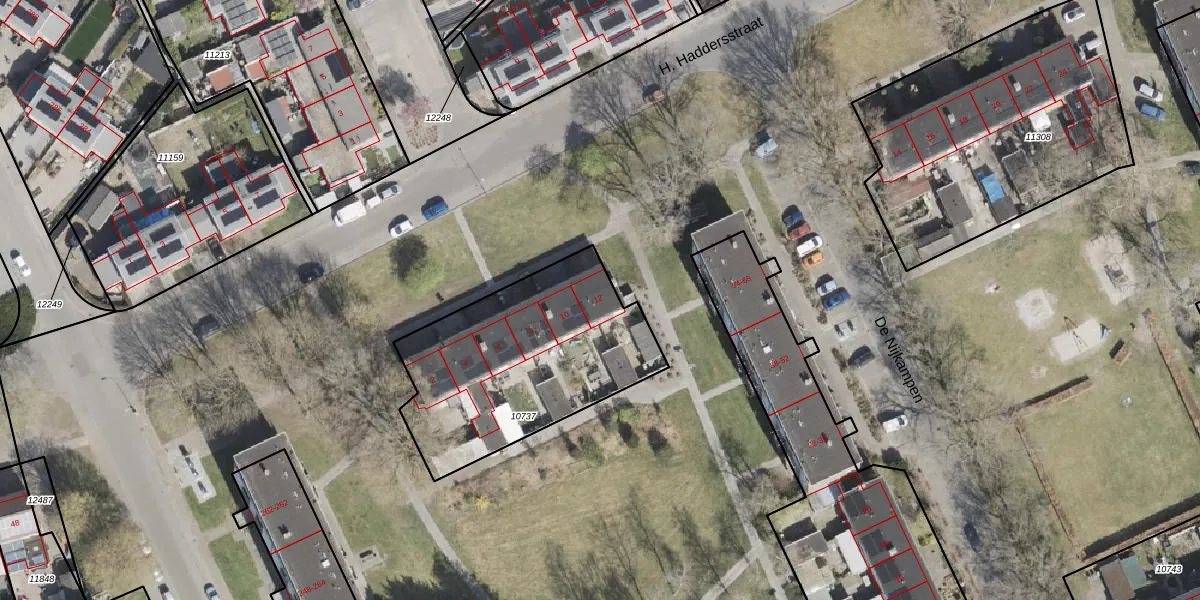 H. Haddersstraat 12 is gelegen op kadastraal perceel EMN00C10737. Deze kadastrale aanduiding is uniek en wordt gebruikt door het Kadaster om eigendomsrechten en andere zakelijke rechten vast te leggen. Het perceel maakt onderdeel uit van de kadastrale gemeente Emmen.