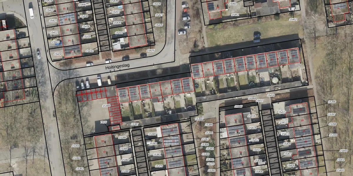 Het perceel waarop Hoitingeslag 12 staat heeft een oppervlakte van 3402 m². Dit is een zeer groot perceel. De perceeloppervlakte wordt geregistreerd door het Kadaster. Gedetailleerde informatie over de maten van dit perceel kunt u vinden in het rapport Kadastrale kaart met maatvoering van Hoitingeslag 12.
