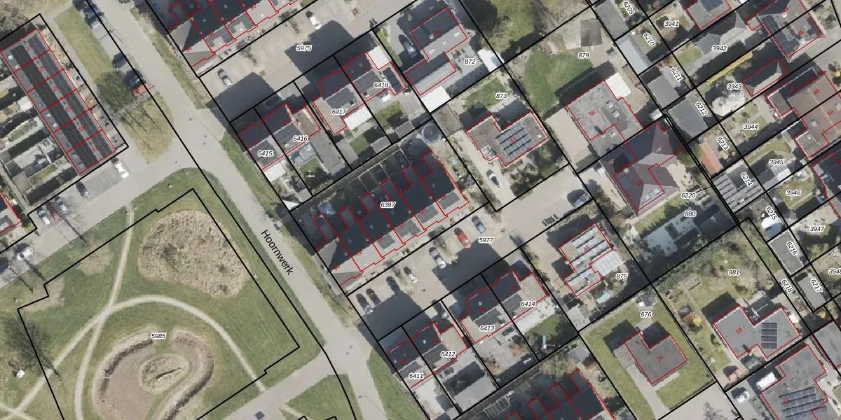 Het perceel waarop Hoornwerk 56 staat heeft een oppervlakte van 985 m². Dit is een groot perceel. De perceeloppervlakte wordt geregistreerd door het Kadaster. Gedetailleerde informatie over de maten van dit perceel kunt u vinden in het rapport Kadastrale kaart met maatvoering van Hoornwerk 56.