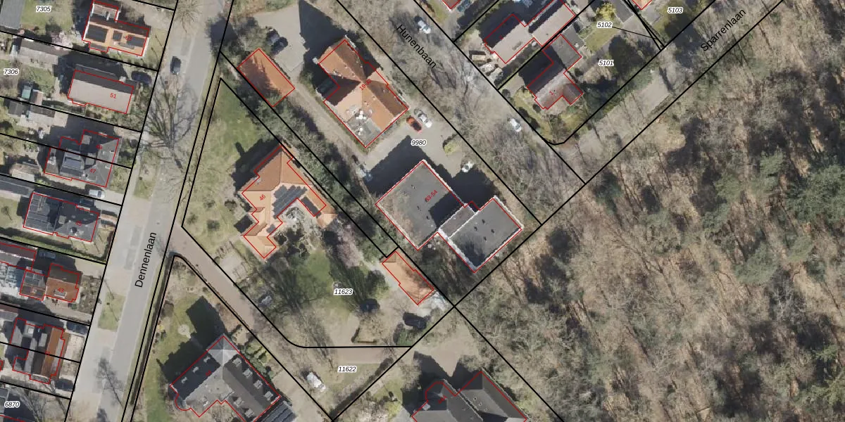 Het perceel waarop Hunenbaan 49 staat heeft een oppervlakte van 2458 m². Dit is een zeer groot perceel. De perceeloppervlakte wordt geregistreerd door het Kadaster. Gedetailleerde informatie over de maten van dit perceel kunt u vinden in het rapport Kadastrale kaart met maatvoering van Hunenbaan 49.