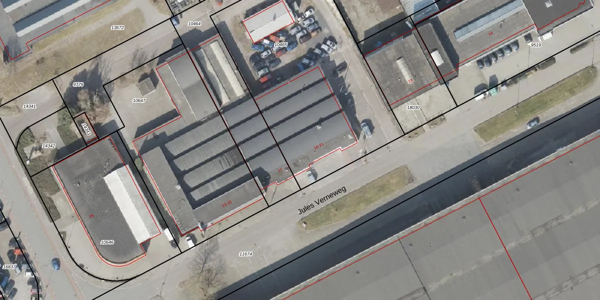 Het perceel waarop Jules Verneweg 19 staat heeft een oppervlakte van 2640 m². Dit is een zeer groot perceel. De perceeloppervlakte wordt geregistreerd door het Kadaster. Gedetailleerde informatie over de maten van dit perceel kunt u vinden in het rapport Kadastrale kaart met maatvoering van Jules Verneweg 19.