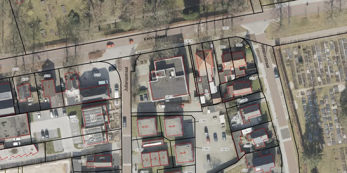 Julianastraat 1-R is gelegen op kadastraal perceel EMN00F13573. Deze kadastrale aanduiding is uniek en wordt gebruikt door het Kadaster om eigendomsrechten en andere zakelijke rechten vast te leggen. Het perceel maakt onderdeel uit van de kadastrale gemeente Emmen.