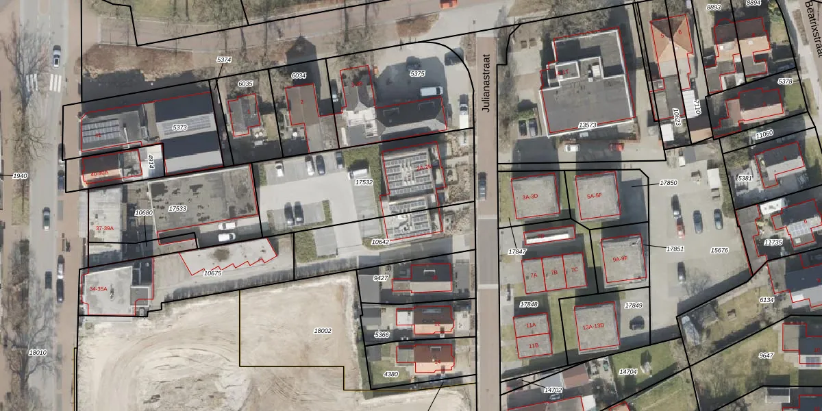 Het perceel waarop Julianastraat 2-L staat heeft een oppervlakte van 965 m². Dit is een groot perceel. De perceeloppervlakte wordt geregistreerd door het Kadaster. Gedetailleerde informatie over de maten van dit perceel kunt u vinden in het rapport Kadastrale kaart met maatvoering van Julianastraat 2-L.