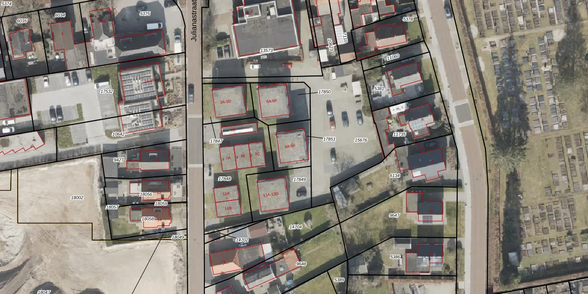Julianastraat 9-F is gelegen op kadastraal perceel EMN00F17851. Deze kadastrale aanduiding is uniek en wordt gebruikt door het Kadaster om eigendomsrechten en andere zakelijke rechten vast te leggen. Het perceel maakt onderdeel uit van de kadastrale gemeente Emmen.