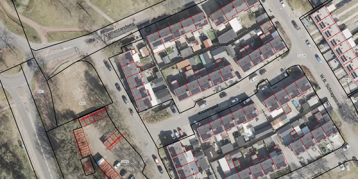 Het perceel waarop Krozenpad 1 staat heeft een oppervlakte van 4109 m². Dit is een zeer groot perceel. De perceeloppervlakte wordt geregistreerd door het Kadaster. Gedetailleerde informatie over de maten van dit perceel kunt u vinden in het rapport Kadastrale kaart met maatvoering van Krozenpad 1.