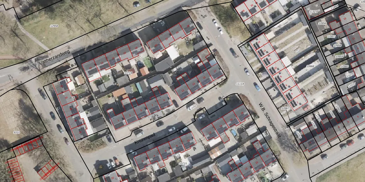 Het perceel waarop Krozenpad 11 staat heeft een oppervlakte van 4109 m². Dit is een zeer groot perceel. De perceeloppervlakte wordt geregistreerd door het Kadaster. Gedetailleerde informatie over de maten van dit perceel kunt u vinden in het rapport Kadastrale kaart met maatvoering van Krozenpad 11.