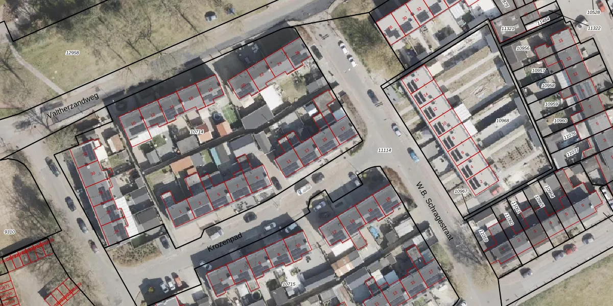 Het perceel waarop Krozenpad 13 staat heeft een oppervlakte van 4109 m². Dit is een zeer groot perceel. De perceeloppervlakte wordt geregistreerd door het Kadaster. Gedetailleerde informatie over de maten van dit perceel kunt u vinden in het rapport Kadastrale kaart met maatvoering van Krozenpad 13.