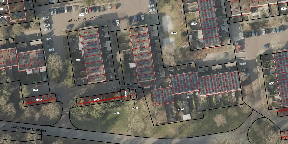 Het perceel waarop Laan van de Eekharst 185 staat heeft een oppervlakte van 3273 m². Dit is een zeer groot perceel. De perceeloppervlakte wordt geregistreerd door het Kadaster. Gedetailleerde informatie over de maten van dit perceel kunt u vinden in het rapport Kadastrale kaart met maatvoering van Laan van de Eekharst 185.