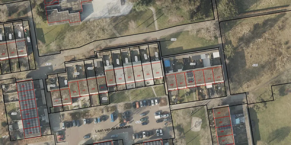 Laan van de Eekharst 261 is gelegen op kadastraal perceel EMN00L5950. Deze kadastrale aanduiding is uniek en wordt gebruikt door het Kadaster om eigendomsrechten en andere zakelijke rechten vast te leggen. Het perceel maakt onderdeel uit van de kadastrale gemeente Emmen.