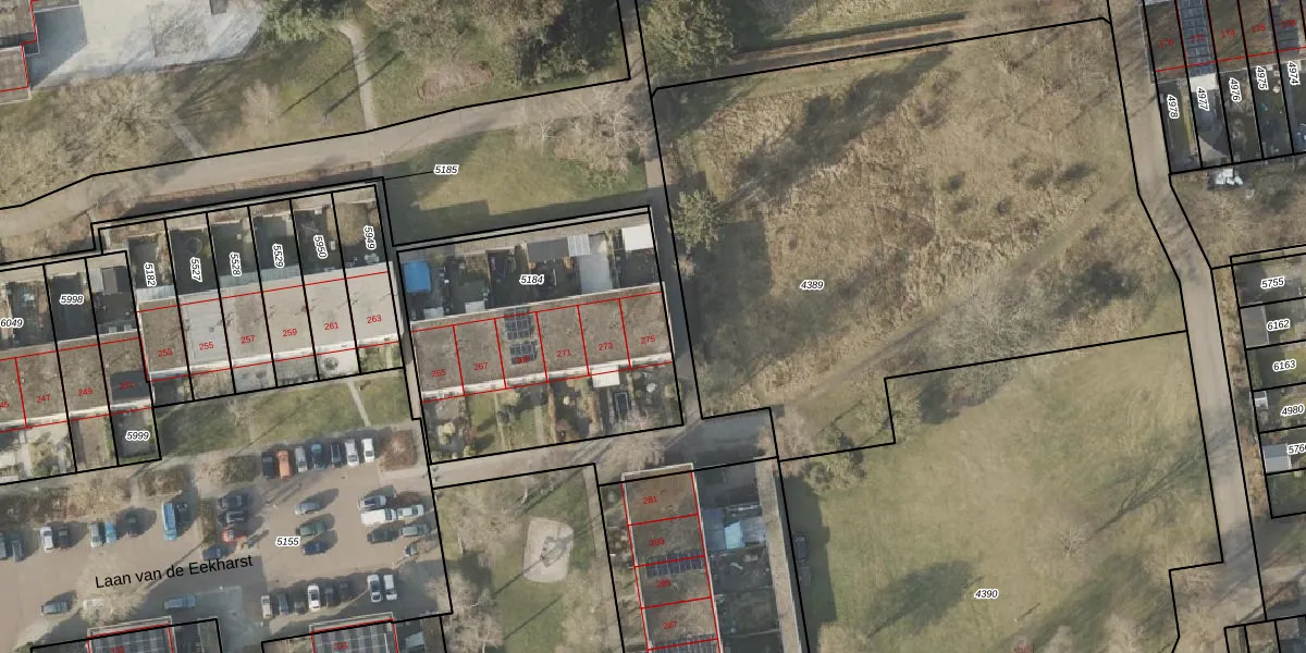 Laan van de Eekharst 275 is gelegen op kadastraal perceel EMN00L5184. Deze kadastrale aanduiding is uniek en wordt gebruikt door het Kadaster om eigendomsrechten en andere zakelijke rechten vast te leggen. Het perceel maakt onderdeel uit van de kadastrale gemeente Emmen.