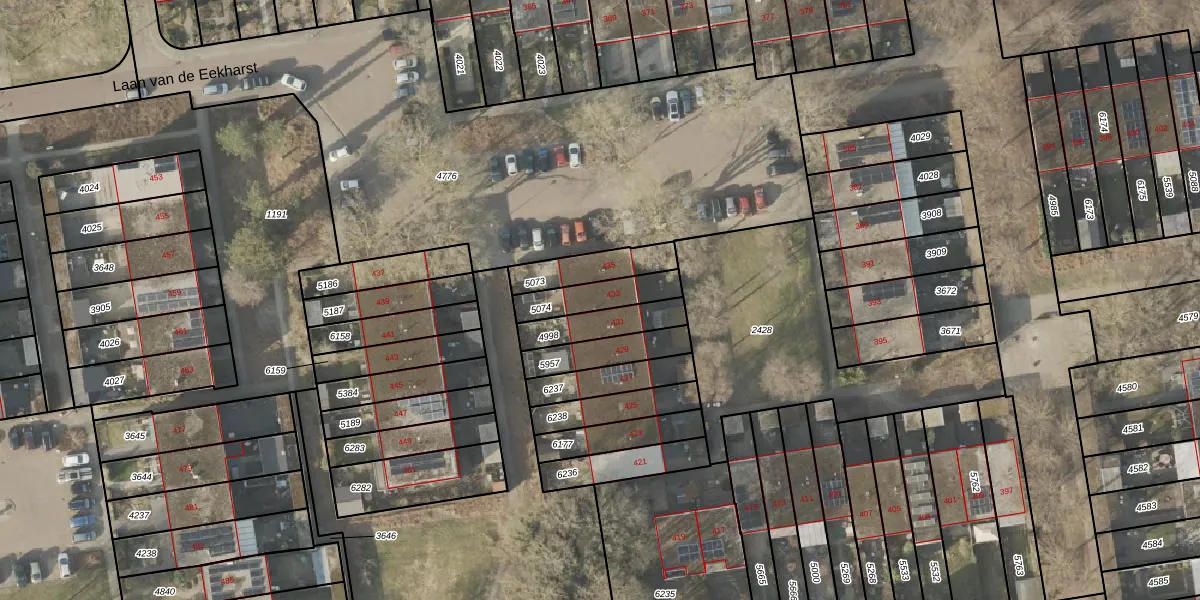 Laan van de Eekharst 433 is gelegen op kadastraal perceel EMN00L5074. Deze kadastrale aanduiding is uniek en wordt gebruikt door het Kadaster om eigendomsrechten en andere zakelijke rechten vast te leggen. Het perceel maakt onderdeel uit van de kadastrale gemeente Emmen.
