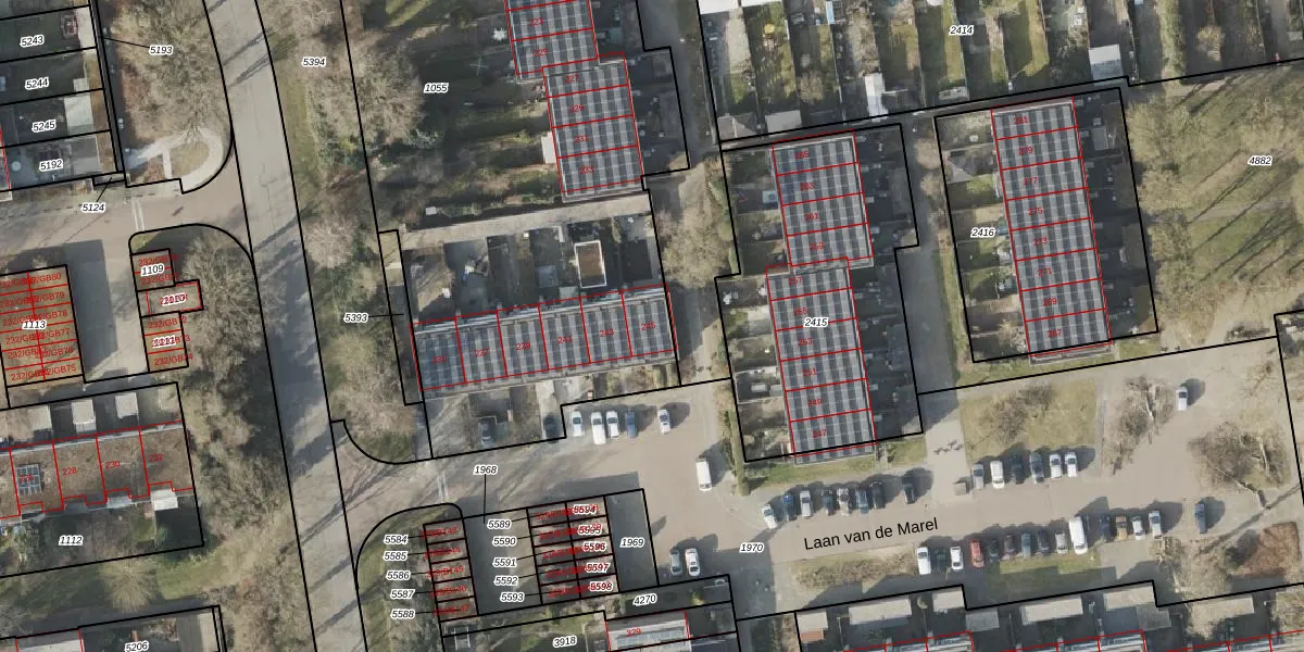 Het perceel waarop Laan van de Marel 245 staat heeft een oppervlakte van 3624 m². Dit is een zeer groot perceel. De perceeloppervlakte wordt geregistreerd door het Kadaster. Gedetailleerde informatie over de maten van dit perceel kunt u vinden in het rapport Kadastrale kaart met maatvoering van Laan van de Marel 245.