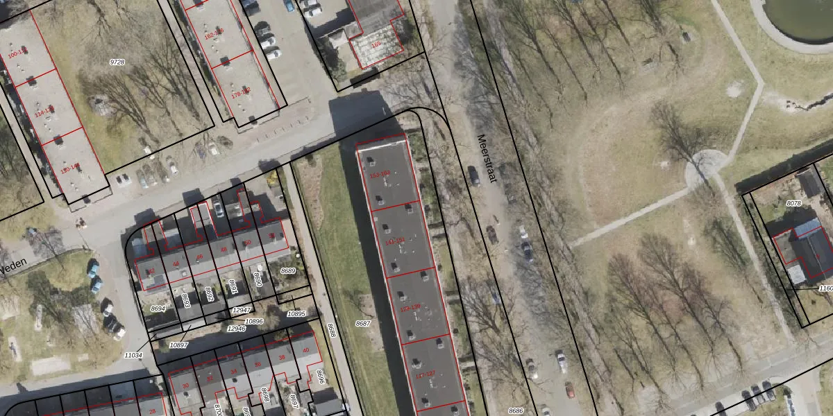 Het perceel waarop Meerstraat 149 staat heeft een oppervlakte van 2655 m². Dit is een zeer groot perceel. De perceeloppervlakte wordt geregistreerd door het Kadaster. Gedetailleerde informatie over de maten van dit perceel kunt u vinden in het rapport Kadastrale kaart met maatvoering van Meerstraat 149.