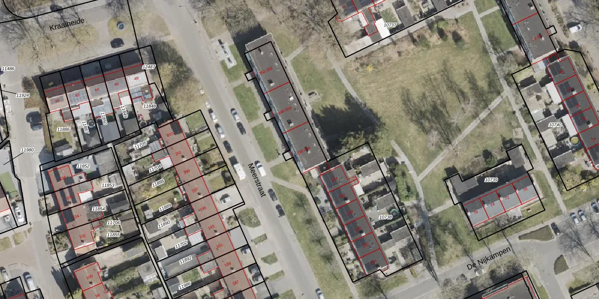 Het perceel waarop Meerstraat 240 staat heeft een oppervlakte van 1477 m². Dit is een zeer groot perceel. De perceeloppervlakte wordt geregistreerd door het Kadaster. Gedetailleerde informatie over de maten van dit perceel kunt u vinden in het rapport Kadastrale kaart met maatvoering van Meerstraat 240.