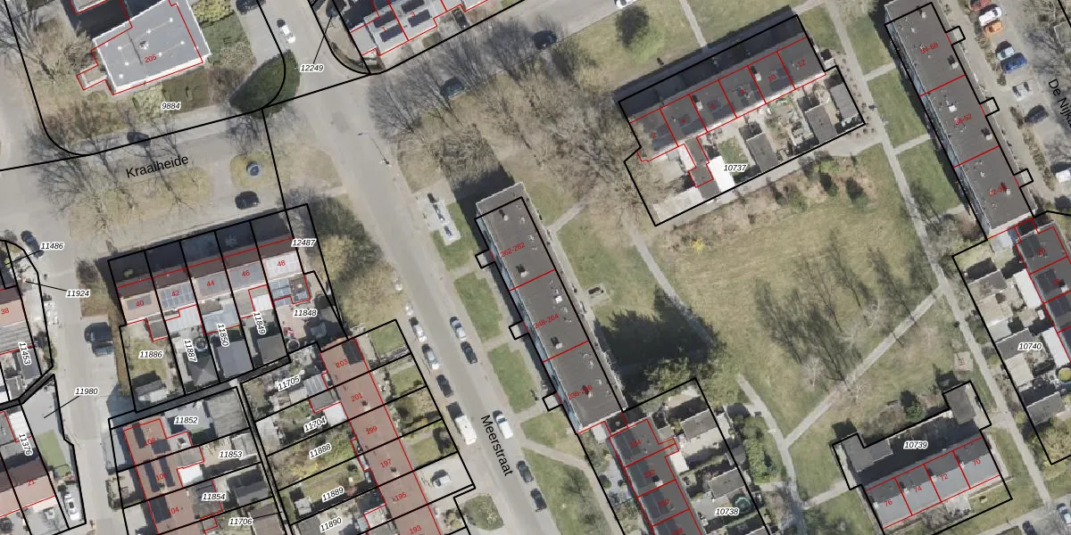 Het perceel waarop Meerstraat 262 staat heeft een oppervlakte van 1477 m². Dit is een zeer groot perceel. De perceeloppervlakte wordt geregistreerd door het Kadaster. Gedetailleerde informatie over de maten van dit perceel kunt u vinden in het rapport Kadastrale kaart met maatvoering van Meerstraat 262.
