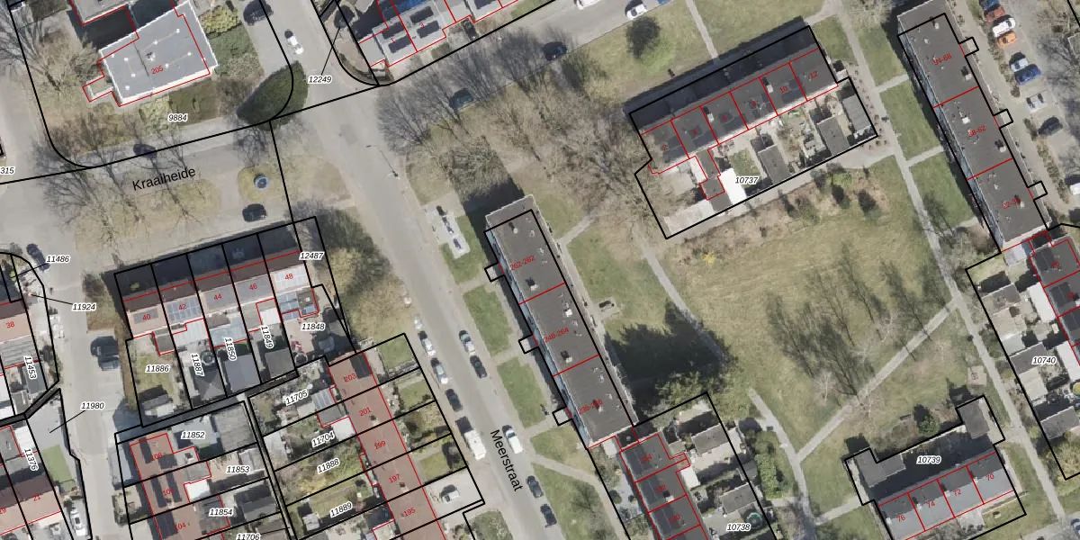 Het perceel waarop Meerstraat 266 staat heeft een oppervlakte van 1477 m². Dit is een zeer groot perceel. De perceeloppervlakte wordt geregistreerd door het Kadaster. Gedetailleerde informatie over de maten van dit perceel kunt u vinden in het rapport Kadastrale kaart met maatvoering van Meerstraat 266.