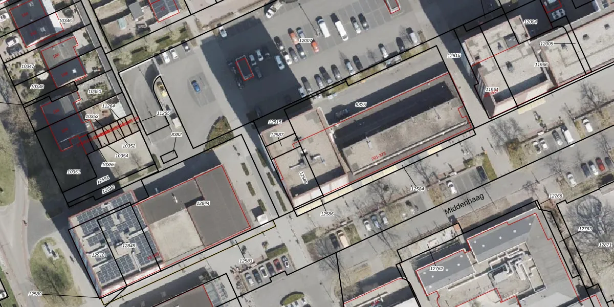 Het perceel waarop Middenhaag 223 staat heeft een oppervlakte van 1639 m². Dit is een zeer groot perceel. De perceeloppervlakte wordt geregistreerd door het Kadaster. Gedetailleerde informatie over de maten van dit perceel kunt u vinden in het rapport Kadastrale kaart met maatvoering van Middenhaag 223.