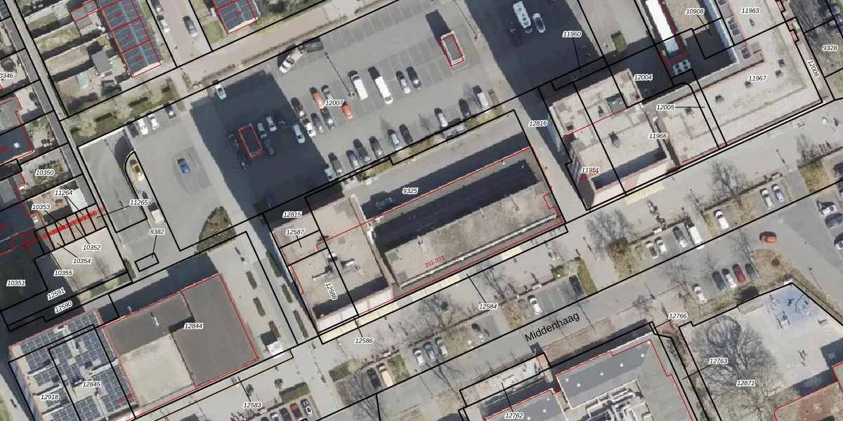Het perceel waarop Middenhaag 369 staat heeft een oppervlakte van 1639 m². Dit is een zeer groot perceel. De perceeloppervlakte wordt geregistreerd door het Kadaster. Gedetailleerde informatie over de maten van dit perceel kunt u vinden in het rapport Kadastrale kaart met maatvoering van Middenhaag 369.