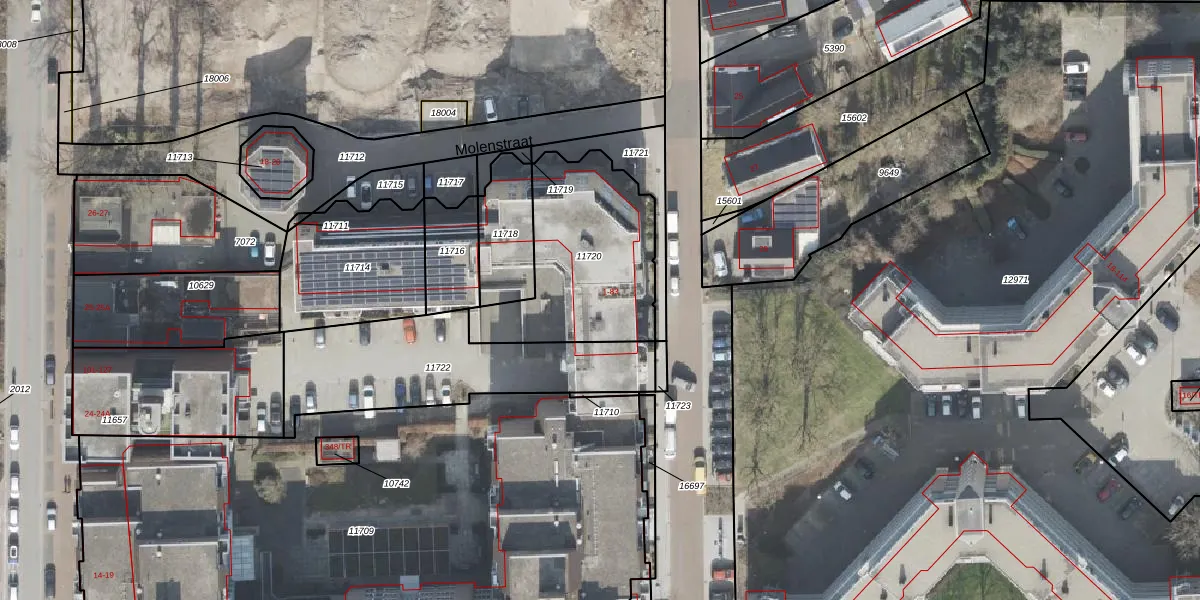 Het perceel waarop Molenstraat 43 staat heeft een oppervlakte van 666 m². Dit is een groot perceel. De perceeloppervlakte wordt geregistreerd door het Kadaster. Gedetailleerde informatie over de maten van dit perceel kunt u vinden in het rapport Kadastrale kaart met maatvoering van Molenstraat 43.