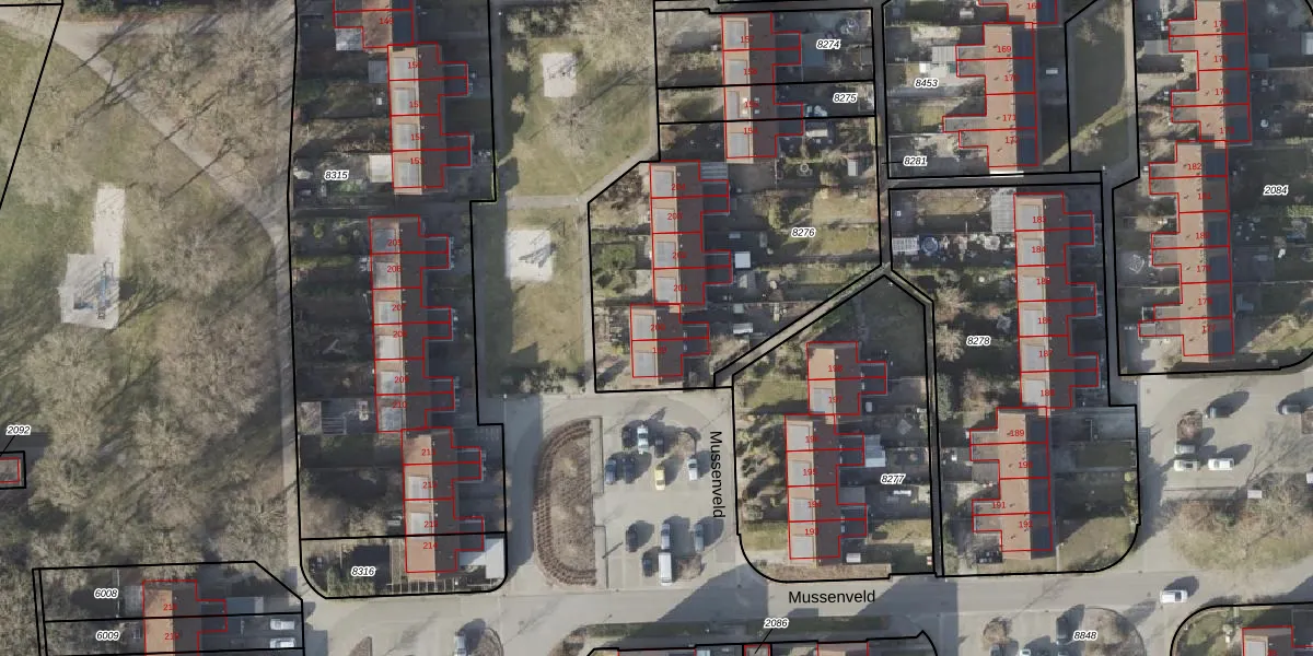 Mussenveld 200 is gelegen op kadastraal perceel EMN00W8276. Deze kadastrale aanduiding is uniek en wordt gebruikt door het Kadaster om eigendomsrechten en andere zakelijke rechten vast te leggen. Het perceel maakt onderdeel uit van de kadastrale gemeente Emmen.
