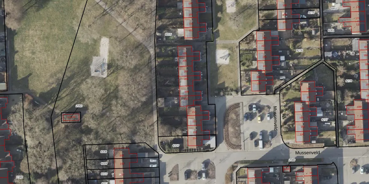 Het perceel waarop Mussenveld 209 staat heeft een oppervlakte van 2682 m². Dit is een zeer groot perceel. De perceeloppervlakte wordt geregistreerd door het Kadaster. Gedetailleerde informatie over de maten van dit perceel kunt u vinden in het rapport Kadastrale kaart met maatvoering van Mussenveld 209.