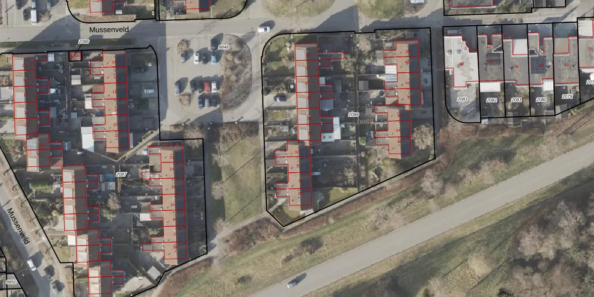 Het perceel waarop Mussenveld 32 staat heeft een oppervlakte van 3136 m². Dit is een zeer groot perceel. De perceeloppervlakte wordt geregistreerd door het Kadaster. Gedetailleerde informatie over de maten van dit perceel kunt u vinden in het rapport Kadastrale kaart met maatvoering van Mussenveld 32.
