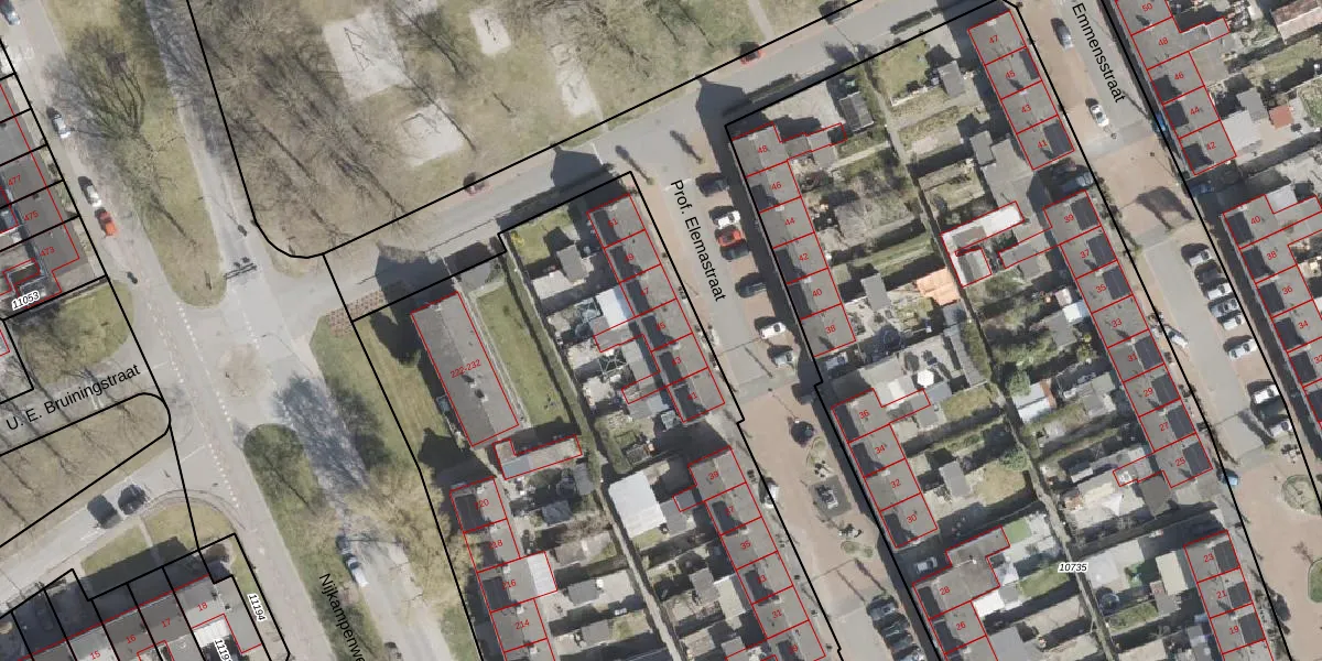 Prof. Elemastraat 45 is gelegen op kadastraal perceel EMN00C10734. Deze kadastrale aanduiding is uniek en wordt gebruikt door het Kadaster om eigendomsrechten en andere zakelijke rechten vast te leggen. Het perceel maakt onderdeel uit van de kadastrale gemeente Emmen.