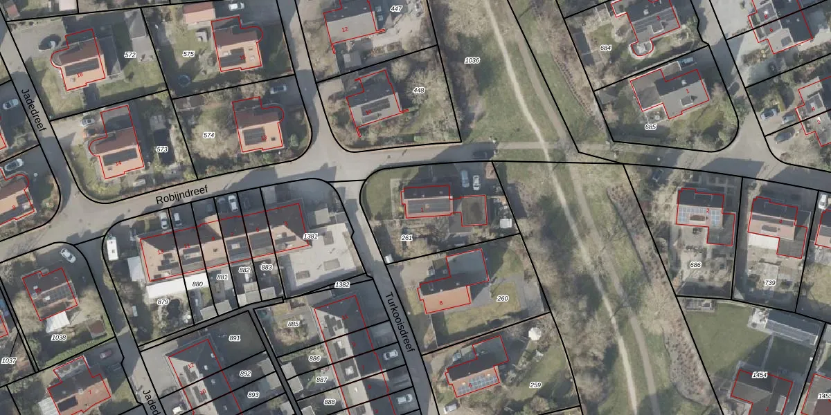 Het perceel waarop Robijndreef 1 staat heeft een oppervlakte van 697 m². Dit is een groot perceel. De perceeloppervlakte wordt geregistreerd door het Kadaster. Gedetailleerde informatie over de maten van dit perceel kunt u vinden in het rapport Kadastrale kaart met maatvoering van Robijndreef 1.