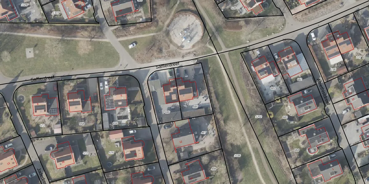 Het perceel waarop Saffierdreef 1 staat heeft een oppervlakte van 460 m². Dit is een groot perceel. De perceeloppervlakte wordt geregistreerd door het Kadaster. Gedetailleerde informatie over de maten van dit perceel kunt u vinden in het rapport Kadastrale kaart met maatvoering van Saffierdreef 1.