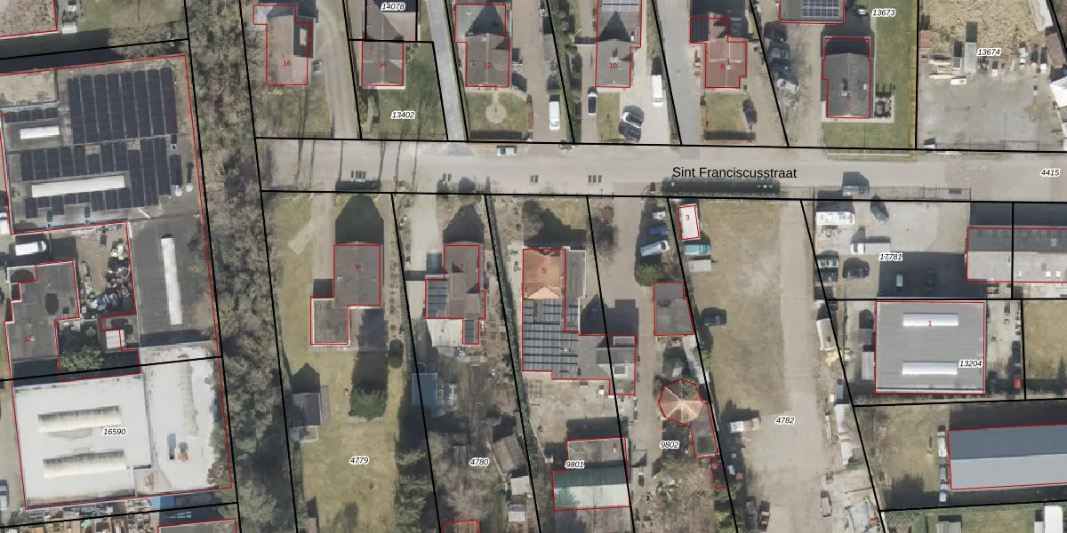 Het perceel waarop Sint Franciscusstraat 5 staat heeft een oppervlakte van 1500 m². Dit is een zeer groot perceel. De perceeloppervlakte wordt geregistreerd door het Kadaster. Gedetailleerde informatie over de maten van dit perceel kunt u vinden in het rapport Kadastrale kaart met maatvoering van Sint Franciscusstraat 5.
