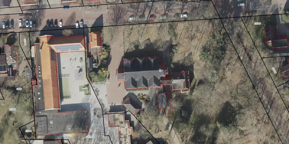 Het perceel waarop Splitting 142-A staat heeft een oppervlakte van 2,8 ha. Dit is een zeer groot perceel. De perceeloppervlakte wordt geregistreerd door het Kadaster. Gedetailleerde informatie over de maten van dit perceel kunt u vinden in het rapport Kadastrale kaart met maatvoering van Splitting 142-A.