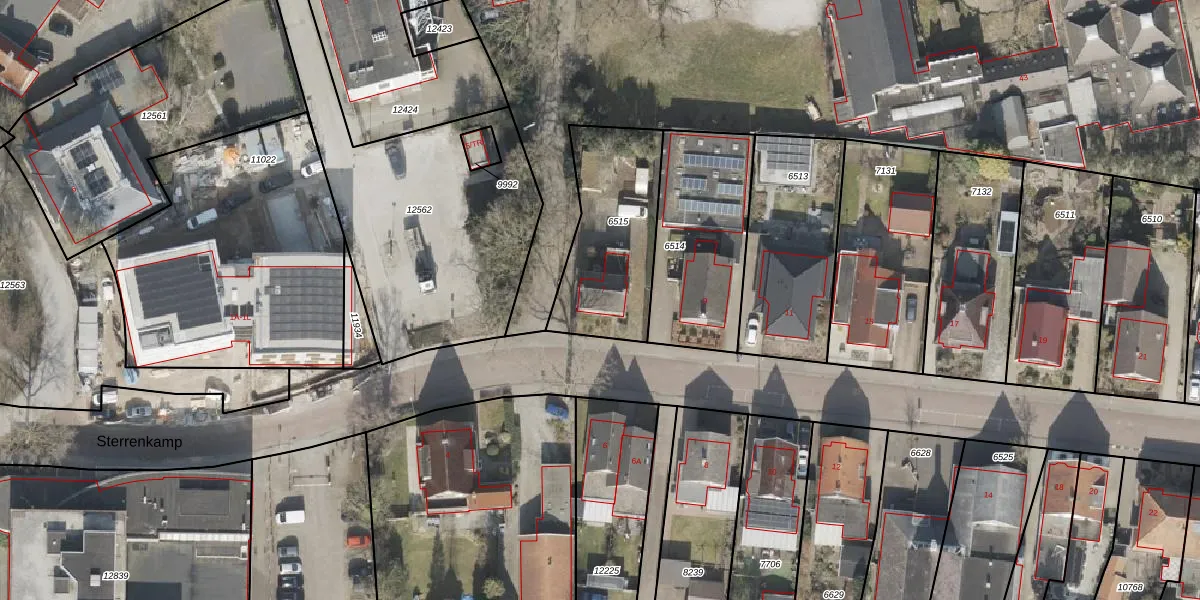 Het perceel waarop Sterrenkamp 7 staat heeft een oppervlakte van 515 m². Dit is een groot perceel. De perceeloppervlakte wordt geregistreerd door het Kadaster. Gedetailleerde informatie over de maten van dit perceel kunt u vinden in het rapport Kadastrale kaart met maatvoering van Sterrenkamp 7.
