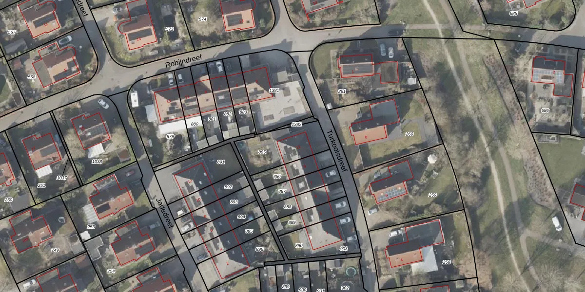 Het perceel waarop Turkooisdreef 11 staat heeft een oppervlakte van 346 m². Dit is een groot perceel. De perceeloppervlakte wordt geregistreerd door het Kadaster. Gedetailleerde informatie over de maten van dit perceel kunt u vinden in het rapport Kadastrale kaart met maatvoering van Turkooisdreef 11.