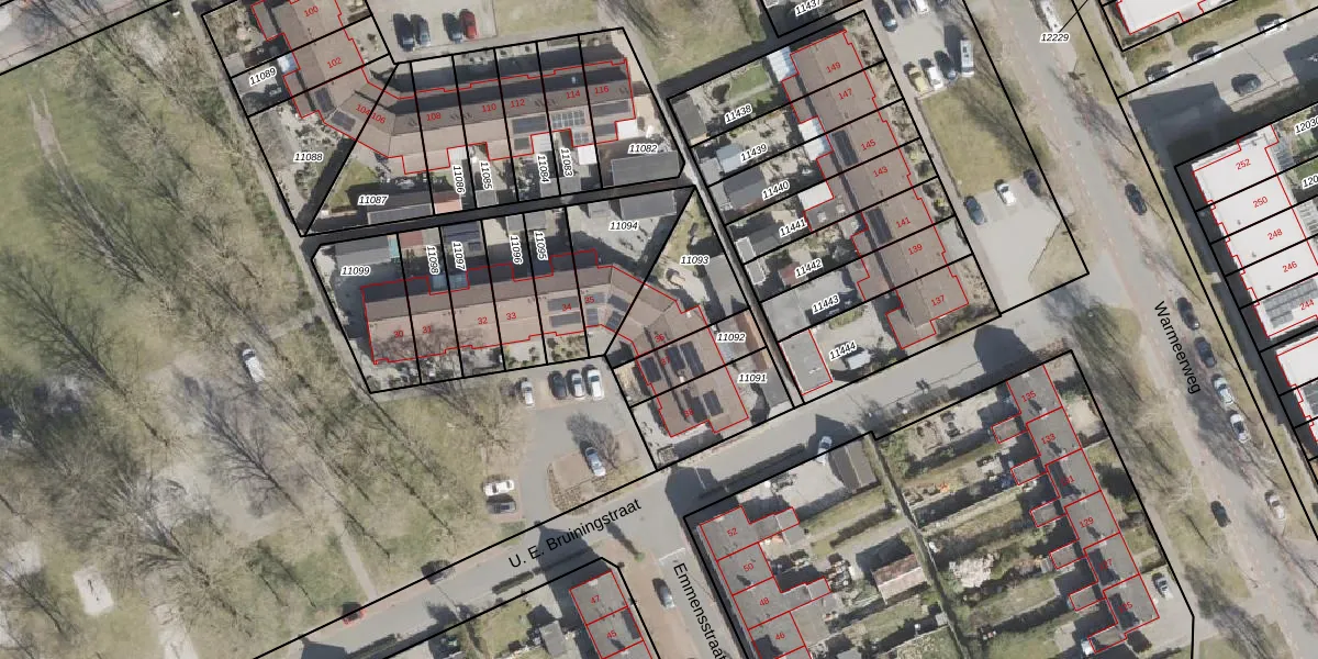 U. E. Bruiningstraat 36 is gelegen op kadastraal perceel EMN00C11093. Deze kadastrale aanduiding is uniek en wordt gebruikt door het Kadaster om eigendomsrechten en andere zakelijke rechten vast te leggen. Het perceel maakt onderdeel uit van de kadastrale gemeente Emmen.