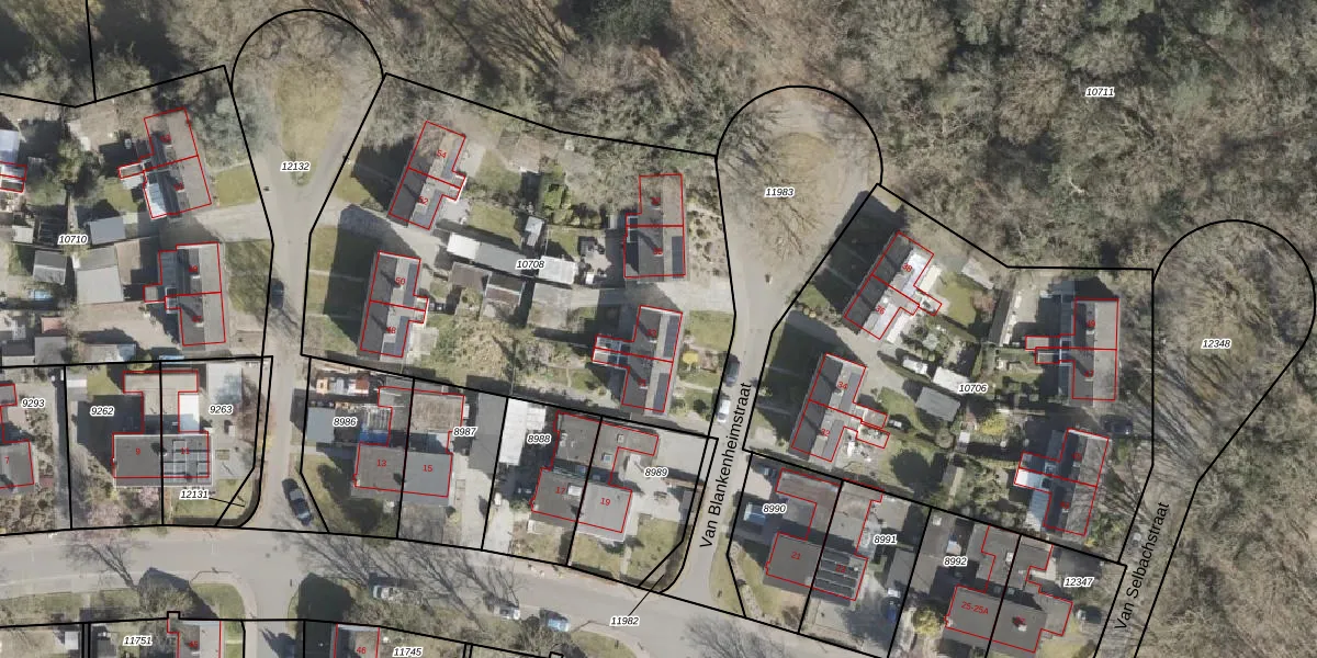 Het perceel waarop Van Blankenheimstraat 33 staat heeft een oppervlakte van 2590 m². Dit is een zeer groot perceel. De perceeloppervlakte wordt geregistreerd door het Kadaster. Gedetailleerde informatie over de maten van dit perceel kunt u vinden in het rapport Kadastrale kaart met maatvoering van Van Blankenheimstraat 33.