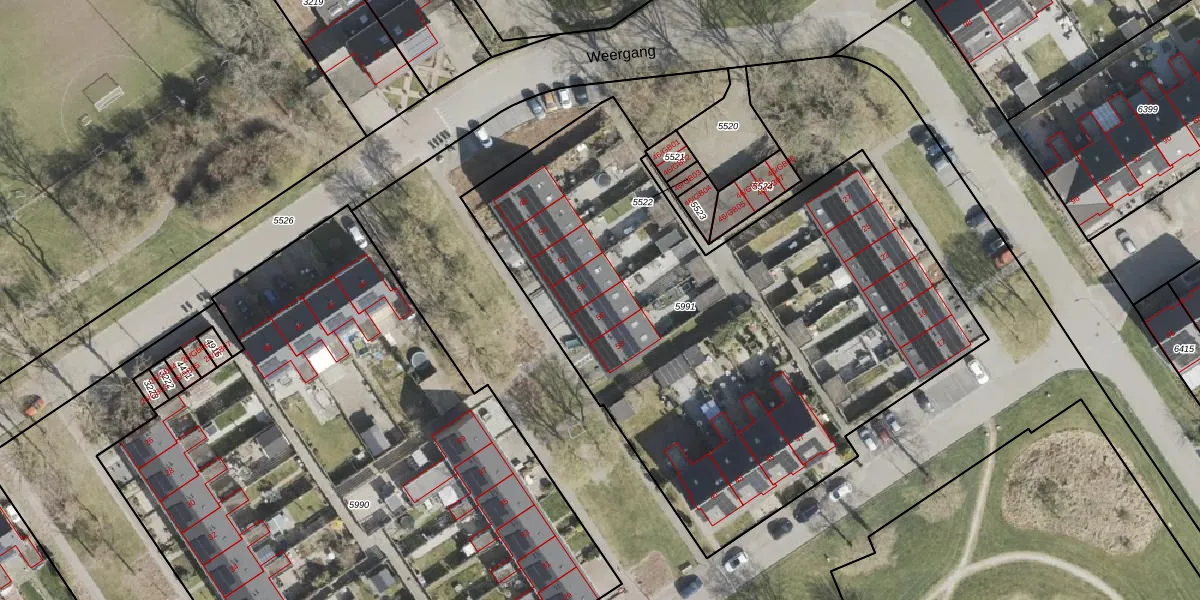 Het perceel waarop Weergang 56 staat heeft een oppervlakte van 3285 m². Dit is een zeer groot perceel. De perceeloppervlakte wordt geregistreerd door het Kadaster. Gedetailleerde informatie over de maten van dit perceel kunt u vinden in het rapport Kadastrale kaart met maatvoering van Weergang 56.
