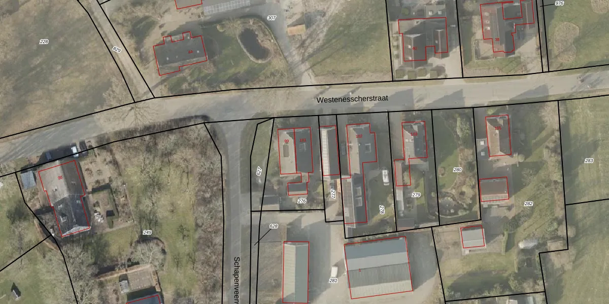 Het perceel waarop Westenesscherstraat 101 staat heeft een oppervlakte van 545 m². Dit is een groot perceel. De perceeloppervlakte wordt geregistreerd door het Kadaster. Gedetailleerde informatie over de maten van dit perceel kunt u vinden in het rapport Kadastrale kaart met maatvoering van Westenesscherstraat 101.