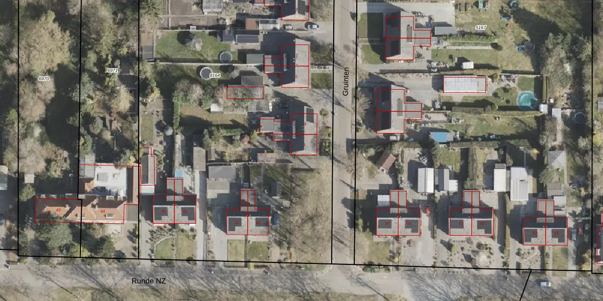 Het perceel waarop Gruinten 1 staat heeft een oppervlakte van 8140 m². Dit is een zeer groot perceel. De perceeloppervlakte wordt geregistreerd door het Kadaster. Gedetailleerde informatie over de maten van dit perceel kunt u vinden in het rapport Kadastrale kaart met maatvoering van Gruinten 1.