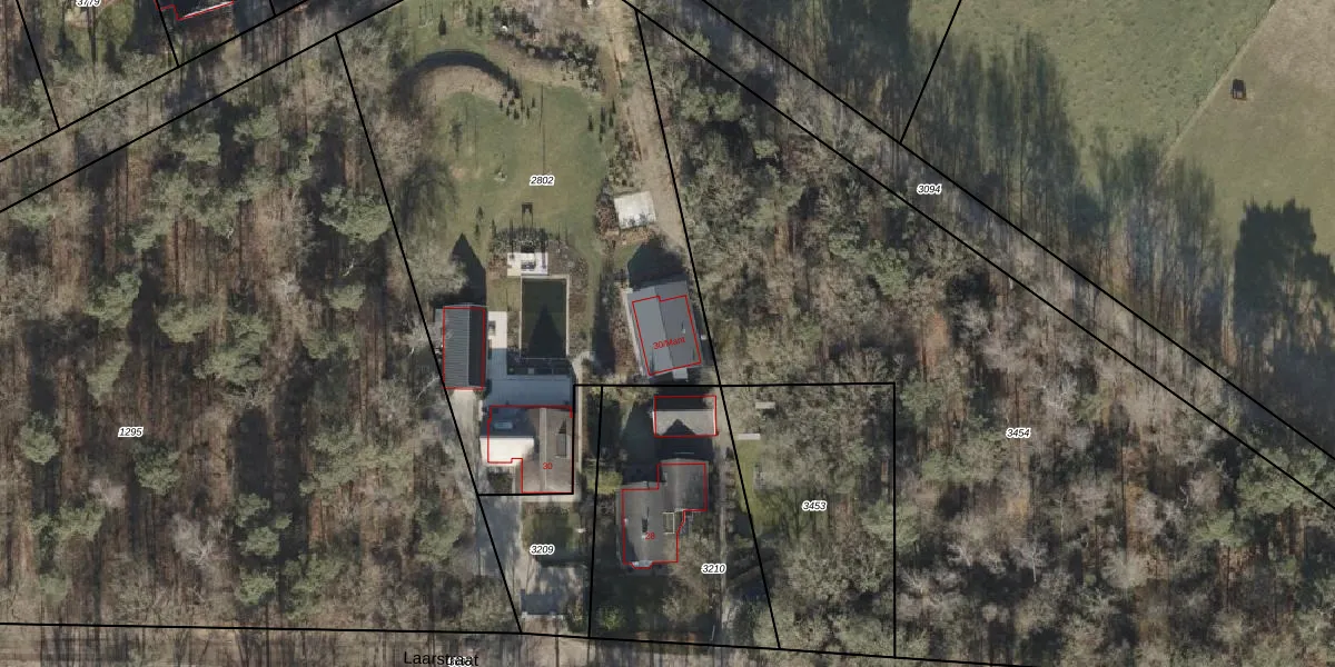 Het perceel waarop Laarstraat 30-Mant staat heeft een oppervlakte van 2810 m². Dit is een zeer groot perceel. De perceeloppervlakte wordt geregistreerd door het Kadaster. Gedetailleerde informatie over de maten van dit perceel kunt u vinden in het rapport Kadastrale kaart met maatvoering van Laarstraat 30-Mant.