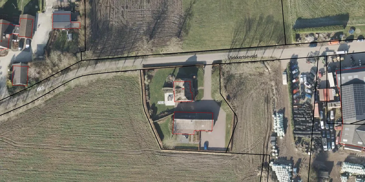 Het perceel waarop Vlekkertseveld 14 staat heeft een oppervlakte van 2015 m². Dit is een zeer groot perceel. De perceeloppervlakte wordt geregistreerd door het Kadaster. Gedetailleerde informatie over de maten van dit perceel kunt u vinden in het rapport Kadastrale kaart met maatvoering van Vlekkertseveld 14.