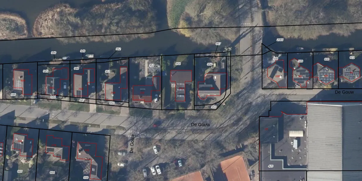 Het perceel waarop De Gouw 20-E staat heeft een oppervlakte van 547 m². Dit is een groot perceel. De perceeloppervlakte wordt geregistreerd door het Kadaster. Gedetailleerde informatie over de maten van dit perceel kunt u vinden in het rapport Kadastrale kaart met maatvoering van De Gouw 20-E.