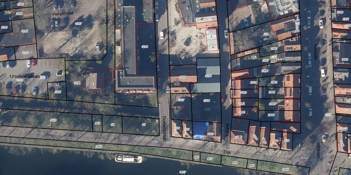 Het perceel waarop Doelenstraat 21 staat heeft een oppervlakte van 228 m². Dit is een middelgroot perceel. De perceeloppervlakte wordt geregistreerd door het Kadaster. Gedetailleerde informatie over de maten van dit perceel kunt u vinden in het rapport Kadastrale kaart met maatvoering van Doelenstraat 21.