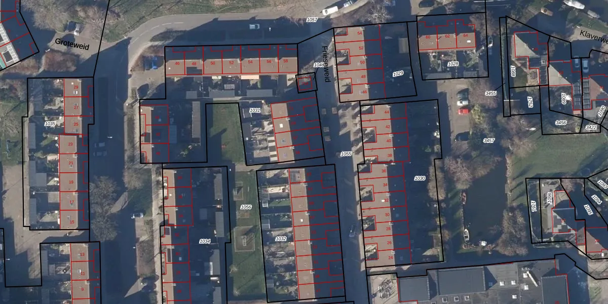 Het perceel waarop Frieseweid 65 staat heeft een oppervlakte van 1788 m². Dit is een zeer groot perceel. De perceeloppervlakte wordt geregistreerd door het Kadaster. Gedetailleerde informatie over de maten van dit perceel kunt u vinden in het rapport Kadastrale kaart met maatvoering van Frieseweid 65.