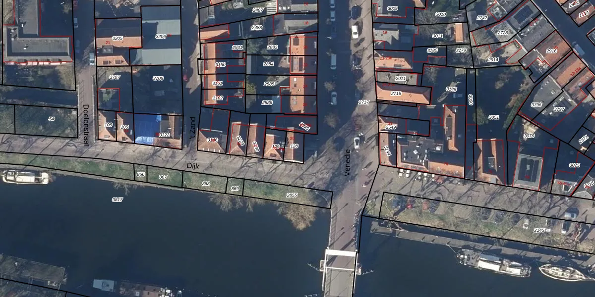 Het perceel waarop Venedie 30 staat heeft een oppervlakte van 68 m². Dit is een klein perceel. De perceeloppervlakte wordt geregistreerd door het Kadaster. Gedetailleerde informatie over de maten van dit perceel kunt u vinden in het rapport Kadastrale kaart met maatvoering van Venedie 30.
