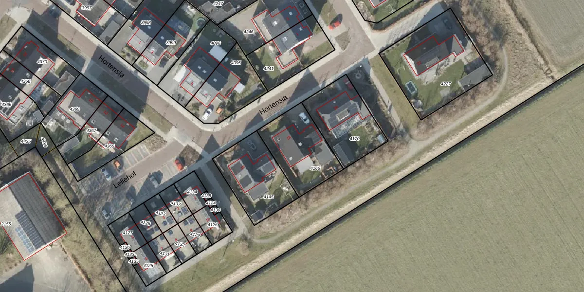 Het perceel waarop Hortensia 18 staat heeft een oppervlakte van 491 m². Dit is een groot perceel. De perceeloppervlakte wordt geregistreerd door het Kadaster. Gedetailleerde informatie over de maten van dit perceel kunt u vinden in het rapport Kadastrale kaart met maatvoering van Hortensia 18.