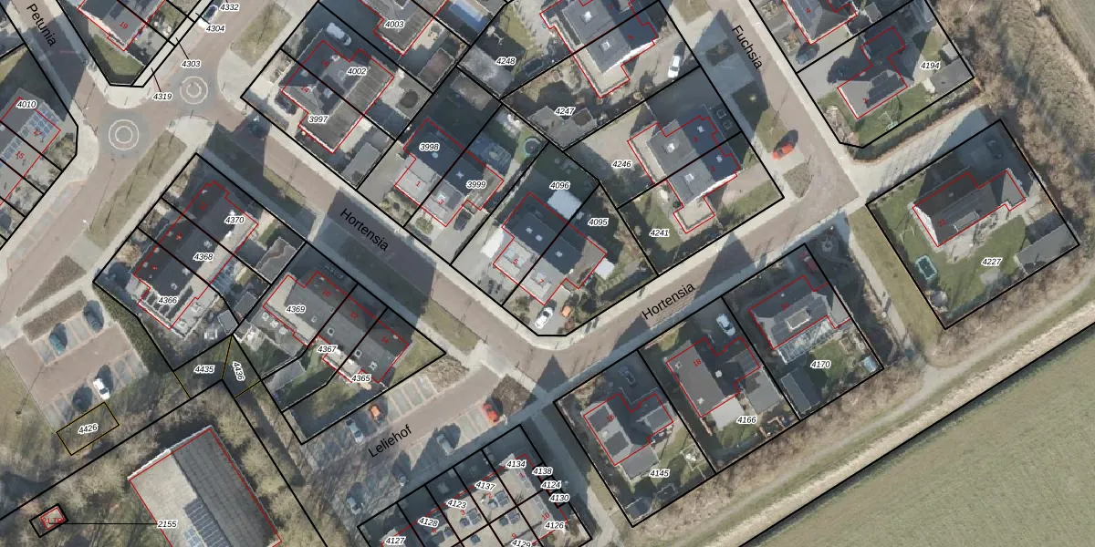 Het perceel waarop Hortensia 7 staat heeft een oppervlakte van 396 m². Dit is een groot perceel. De perceeloppervlakte wordt geregistreerd door het Kadaster. Gedetailleerde informatie over de maten van dit perceel kunt u vinden in het rapport Kadastrale kaart met maatvoering van Hortensia 7.